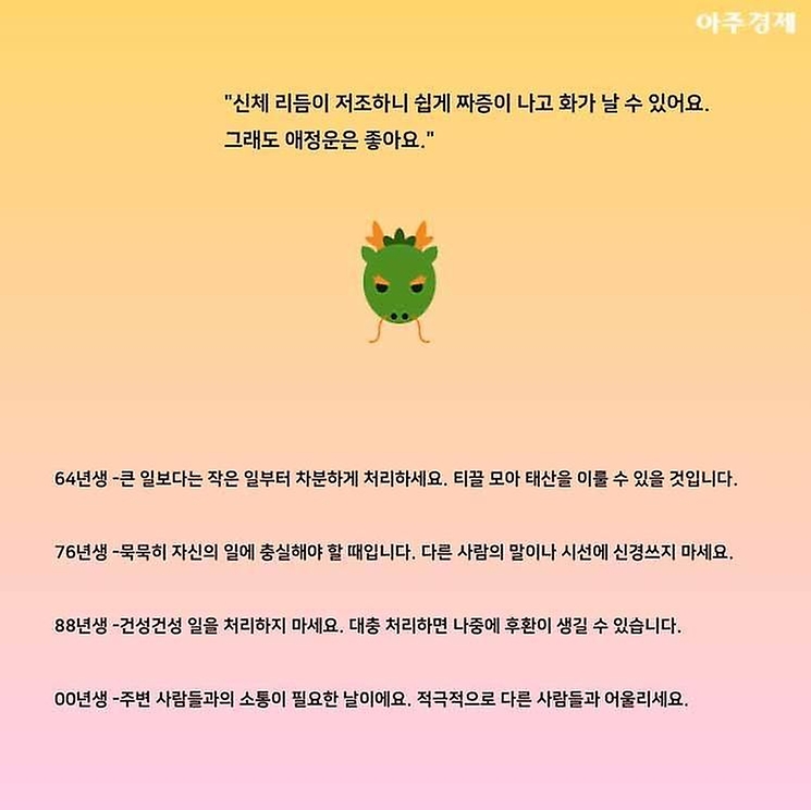 ▶용띠 오늘의 운세 "신체 리듬이 저조하니 쉽게 짜증이 나고 화가 날 수 있어요. 그래도 애정운은 좋아요."