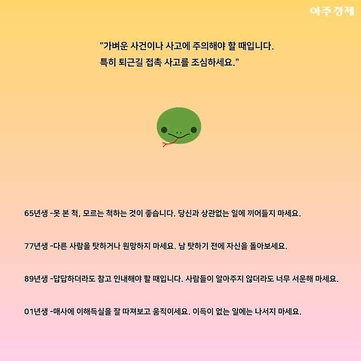 ▶뱀띠 오늘의 운세 "가벼운 사건이나 사고에 주의해야 할 때입니다. 특히 퇴근길 접촉 사고를 조심하세요."